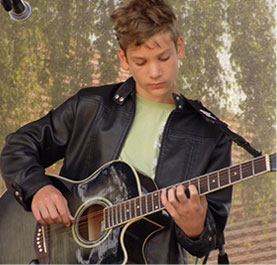 Už od 1. třídy začal chodit do ZUŠ na kytaru. V poslední době ho však víc baví hrát na elektrickou kytaru, na bicí a nově na baskytaru. Je to šikovný muzikant s citem pro rytmus. Se svojí rozpolcenou povahou ze znamení blížence, dokáže zahrát na cokoliv, ale často také na nic. Většinou však jeho lepší Já nakonec zvítězí.